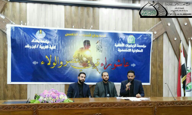 حضر وفد خدام العتبة الكاظمية المقدسة المهرجان السنوي الخامس الذي أقامته كلية التربية للعلوم الإنسانية/ ابن رشد بالتعاون مع مؤسسة الزينبيات الثقافية التعاونية التخصصية، يوم الأحد 22 تشرين الأول 2017 تحت شعار: (عاشوراء قوافي النصر والولاء)، والقيت خلال حفل افتتاح المهرجان كلمات عدّة بيّنت دور المسيرة الحسينية ومبادئها وأهدافها العليا وما تحمله من حس رسالي وقيم إنسانية تسهم إسهاماً كبيراً في مجالات الحياة كافة، كما تخلل المهرجان إلقاء القصائد الشعرية ومشاركة فاعلة لفرقة إنشاد الجوادين "عليهما السلام". من الجدير بالذكر أن الأمانة العامة للعتبة الكاظمية المقدسة تحرص على المشاركة في هذه التظاهرة الثقافية السنوية وذلك لدعمها للمسيرة العلمية والثقافية ونشر الثقافة الإسلامية بين الأوساط الجامعية والانفتاح والتواصل مع المؤسسات العلمية والتربوية والفكرية والثقافية ومد جسور التعاون في نشر فكر وعقيدة آل البيت "عليهم السلام".