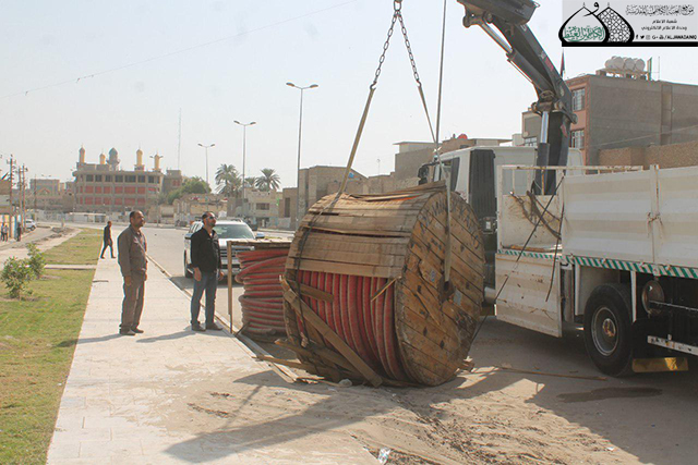 وأضاف الحيدري قائلاً: تم نصب عشرة مصادر طاقة ثابتة (pillar) على جانبي شارع الإمام علي "عليه السلام" وتغذيتها بواسطة قابلوات قياس ( 3X240+120mm2 )، وبطول إجمالي مقداره (1250) م من المحطة الصندوقية (KIOSK)، وذلك لتكون مصادر تغذية ثابتة وجاهزة لاستقبال الأحمال وخصوصاً عند الزيارات والمناسبات الدينية، وفي الوقت ذاته تم تحويل مصدر تغذية أعمدة إنارة شارع الإمام علي "عليه السلام" على هذه المحطة الصندوقية ليتم بذلك السيطرة على هذه الأعمدة من جهة العتبة مباشرة، وذلك لأن المحطة مجهزة بمصدر الطاقة البديلة (خط مولدة من العتبة) مما يضمن استمرارية إنارة الشارع دون انقطاع تحت أي ظرف من الظروف.