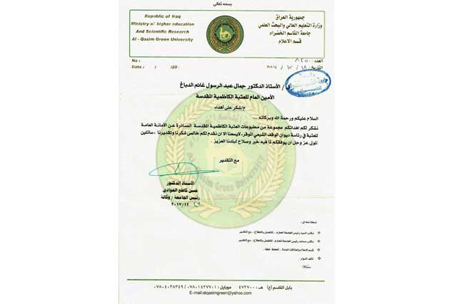 رئاسة جامعة القاسم الخضراء تتوجه بشكرها وتقديرها إلى الأمين العام للعتبة الكاظمية المقدسة