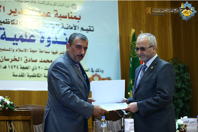 إيماناً منها بنشر فكر وتراث أئمة الهدى(عليهم السلام) الحافل بالعطاء العلمي والفكري والمعرفي, وانطلاقاً من ضرورة الفائدة من مدرسة سيد الوصيين وإمام المتقين علي بن أبي طالب(عليه السلام) الرائدة التي رفدت الساحة الإسلامية بشتى مجالات الحياة العلمية والمعرفية ولتسليط الضوء على مرحلة مهمة من مراحل الرسالة المحمدية وهي التبليغ بنبأ ولاية أمير المؤمنين علي بن أبي طالب(عليه السلام) على كل مسلم ومسلمة, عقدت الأمانة العامة للعتبة الكاظمية المقدسة ندوتها العلمية بمناسبة حلول عيد الله الأعظم عيد الغدير الأغر,صباح يوم السبت 20 ذي الحجة 1434هـ الموافق26/10/2013م وعلى قاعة الحمزة بن عبد المطلب (عليه السلام) في رحاب الصحن الكاظمي الشريف.