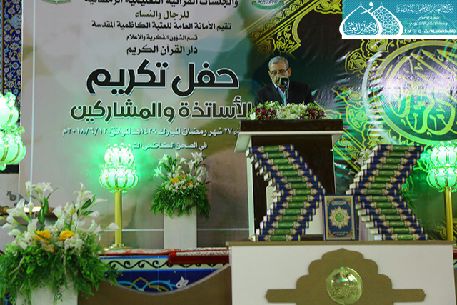 تلتها كلمة دار القرآن الكريم، ألقاها مديرها الحاج جلال علي محمد مبيّناً: أرى من المناسب في هذا المقام إلى الإشارة إلى ظاهرة مؤلمة وهي هجر القرآن الكريم.. فالقرآن الكريم هو رمز الحياة الكريمة ووسيلة للنجاة وسبب لكل رُقي في الدنيا والآخرة فيما لو التزمنا به فقد أنزله تعالى (تِبْيَانًا لِكُلِّ شَيْءٍ وَهُدًى وَرَحْمَةً وَبُشْرَى لِلْمُسْلِمِينَ)، وهو أول الثقلين الذي أوصانا بالتمسك به رسول الله "صلى الله عليه وآله وسلم" فمما يؤسف له أن هذا الكتاب المكتنز بكل ما يبث الحياة وأخلاق الله تعالى غادره الكثيرون فنهلوا من غيره، وانعكس ذلك في السلوك والنظريات والقوانين الوضعية، وقد نجد القرآن الكريم مجرد كتاب للتبرك به وقد تحول إلى كتابات ولوحات مزخرفة تزيّن القاعات والمساجد، وقد نرافقه في شهر رمضان ونهجره بعد انقضاء الشهر.