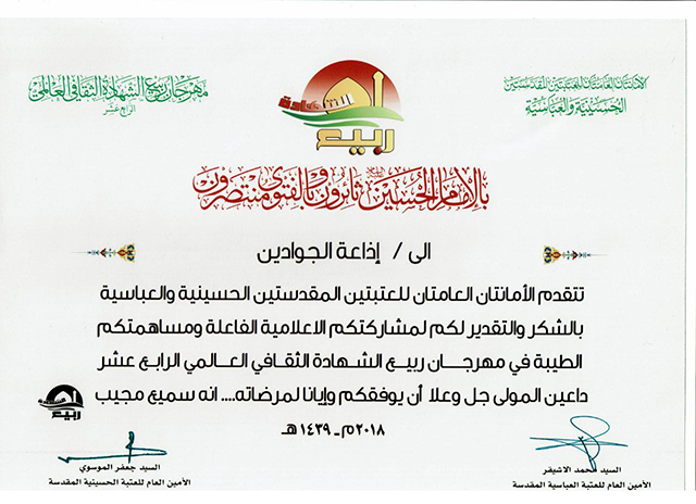 تقدّمت الأمانتان العامتان للعتبتين المقدستين الحسينية والعباسية بالشكر والتقدير إلى وحدتي إذاعة وتلفزيون الجوادين في العتبة الكاظمية المقدسة والتابعة لقسم الشؤون الفكرية والإعلام/ شعبة الإعلام ، وذلك تثميناً للجهود المباركة والدور الفاعل في مشاركتها الإعلامية في مهرجان ربيع الشهادة الثقافي العالمي الرابع عشر الذي أقيم تحت شعار: ( بالإمام الحسين "عليه السلام " ثائرون وبالفتوى منتصرون )، متمنين دوام التوفيق والسداد.