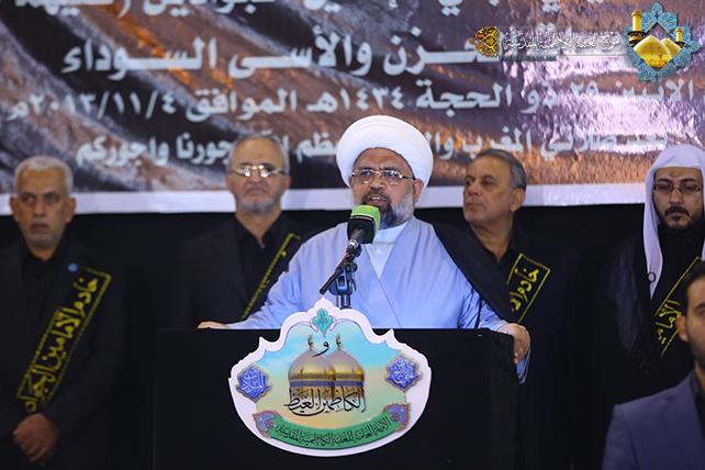وأضاف: (ينبغي أن نتعلم منه كما تعلم العظماء والحكماء وقادة الأمم نحو التغيير والإصلاح الدروس من ثورته (عليه السلام) ونهضته في طلب الإصلاح, وليكن شعارنا في إحياء مراسم عاشوراء وممارسة الشعائر بأنواعها إحياءً لمظلوميته واستنكاراً لكل مظاهر الظلم والقهر والاستبداد في الأرض, وان نستقي منها العبرة في التغيير والنهوض والإعداد الرسالي للأمة والمجتمع وتربية الأجيال التربية الإسلامية الصحيحة).