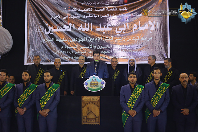 تعتبر ذكرى عاشوراء من الأحداث الكبرى المهمة في التاريخ الإسلامي والتي هزت الضمير الإنساني وغيرت مجرى التاريخ بملحمتها البطولية, لما تحمله في طياتها من قيمٍ ومعانٍ سامية لها وقع كبير في نفوس المسلمين, وبها أضحى الإمام الحسين (عليه السلام) المثل الأعلى للفداء والتضحية ونبراساً للحق، ومناراً للهدى تستضيء به الأُمة الإسلامية, وللإعلان عن بدء موسم الحزن والعزاء في ذكرى استشهاد أبيّ الضيم الإمام الحسين وأهل بيته الأطهار وأصحابه الأخيار (عليهم السلام), أقيمت في رحاب الصحن الكاظمي الشريف في الليلة الأولى من شهر محرم الحرام 1435هـ المراسم السنوية لاستبدال الرايات الخضراء التي تخفق فوق القبتين الشامختين للإمامين الجوادين (عليهما السلام) برايات الحزن السوداء التي تزامنت مع رفعها فوق قباب العتبات المقدسة العلوية والحسينية والعباسية, مواساة للرسول الأكرم(صلى الله عيه وآله) وتجديداً للعهد والولاء للعترة الطاهرة(عليهم السلام) بمصاب سيد شباب أهل الجنة الإمام الحسين(عليه السلام) بحضور الأمين العام للعتبة الكاظمية المقدسة أ.د (جمال الدباغ) وأعضاء مجلس الإدارة, وخَدَمَة الإمامين الجوادين(عليهما السلام) ومشاركة العديد من الشخصيات الدينية والاجتماعية وجمع غفير من أهالي مدينة الكاظمية المقدسة وزائري الإمامين الجوادين(عليهما السلام), استهلت المراسم بتلاوة آيٍ من كتاب الله العزيز شنف بها القارئ(منير عاشور) أسماع الحاضرين, بعدها كلمة الأمانة العامة للعتبة الكاظمية المقدسة ألقاها أمينها العام أ.د (جمال الدباغ) جاء فيها:(نقف اليوم وإياكم وقفة تحدٍ وإصرار على مواصلة الدرب وحثّ الخطى على طريق سيد الشهداء(عليه السلام) واستنكار الجريمة البشعة التي أدمت جبين التاريخ بما ارتكبه الأمويون بحقّ عترة رسول الله(صلى الله عليه وآله) الجريمة التي أبكت ملائكة السماء واهتزَ لها عرش الرحمن جل وعلا.