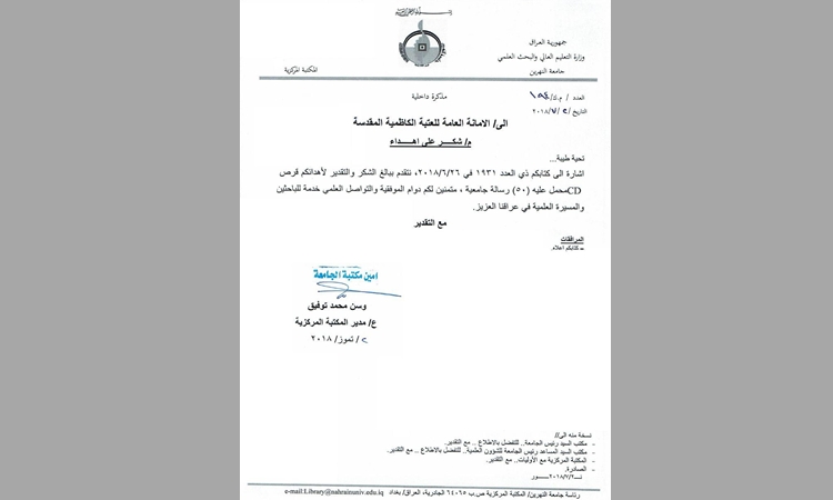 تقدّمت إدارة المكتبة المركزية في جامعة النهرين بالشكر والتقدير إلى الأمانة العامة للعتبة الكاظمية المقدسة، وذلك لأهدائها أقراص مدمجة لأكثر من (50) رسالة جامعية، وتعدّ هذه المبادرة المباركة اهتماما منها بالتواصل في دعم الباحثين والأكاديميين فضلاً عن الاسهام في تعزيز القيم البحثية والعلمية والمعرفية.