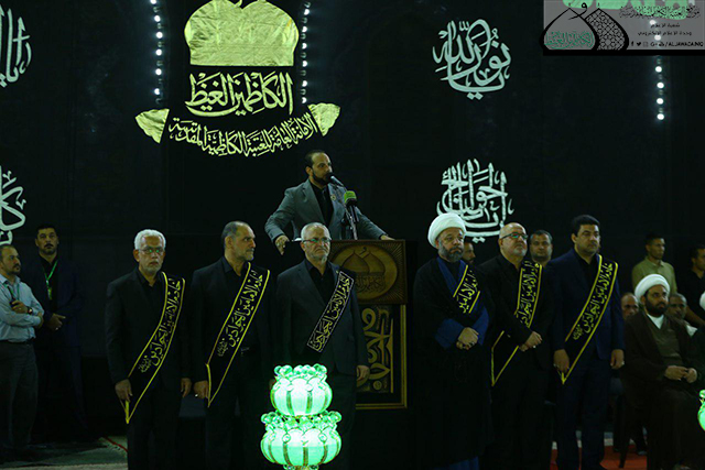 في الوقت ذاته شهدت المراسم تسلم الأمين العام للعتبة الكاظمية المقدسة راية العتبة الشريفة لضريح الإمام الثامن الضامن علي بن موسى الرضا "عليه السلام" من قبل وفد العتبة الرضوية المقدسة المشارك في هذا العزاء.