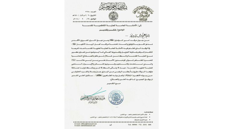 الأمين العام للعتبة العلوية المقدسة يتقدّم بالشكر والتقدير إلى الأمانة العامة للعتبة الكاظمية المقدسة