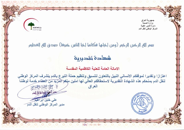 تثميناً للجهود المتميزة التي تقدّمها الأمانة العامة للعتبة الكاظمية المقدسة من خلال سعيها الدؤوب في تشجيع المشاريع الإنسانية، وتعاونها الدائم مع المؤسسات الطبية والصحية، تقدّم مدير المركز الوطني لنقل الدم الدكتور علي خليل إبراهيم الخفاجي بالشكر والتقدير إلى الأمانة العامة للعتبة المقدسة، وذلك لمواقفها النبيلة ومساهمتها الكبيرة في تنظيم الحملات الأسبوعية للتبرع بالدم وتسهيل مهام الفرق الطبية في أداء واجبها، متمنين للقائمين المزيد من العطاء.