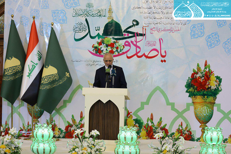 تلتها كلمة العتبة الكاظمية المقدسة وألقاها أمينها العام الأستاذ الدكتور جمال عبد الرسول الدباغ قائلاً: " عندما نحتفلُ بذكرى ولادةِ خاتمِ الأنبياءِ محمدٍ المصطفى " صلى الله عليه وآله وسلم"، فإنَّ هذا يعني أننا نحتفلُ بولادةِ القدوةِ المتمثلَةِ بالأنموذجِ الأمثلِ للإنسانِ الكاملِ، والمنظومةِ الأخلاقيةِ الكاملةِ المهداةِ إلى العالمِ أجمعَ، فإنّ اللهَ تعالى ادّخرَهُ ليختِمَ بهِ أنبياءَهُ ورسلَهُ ويختِمَ بهِ رسالاتِهِ، ويكونَ شاهداً على أمتِهِ وجميعِ الأممِ.
