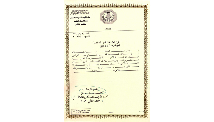 تقدّم قائد الفرقة الثانية/ شرطة اتحادية اللواء الركن أحمد حاتم حميد الأسدي بالشكر والتقدير إلى الأمانة العامة للعتبة الكاظمية المقدسة، وذلك لمساهمتها في إنجاح الاستعراض العسكري الذي شهدته القيادة بمناسبة الذكرى السابعة والتسعين لعيد الشرطة العراقية الأغر، متمنياً لها التوفيق والسداد.