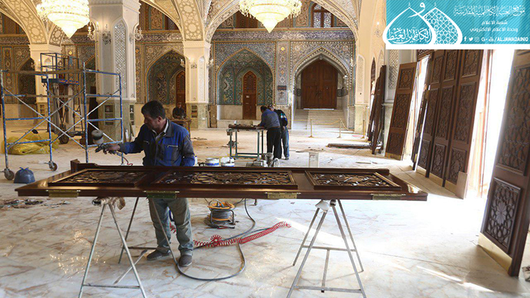 مشروع مسقف الصحن الكاظمي الشريف يشهد نصب الأبواب الخشبية وأعمال الانهاءات