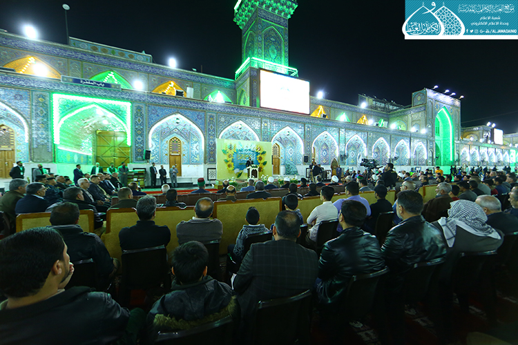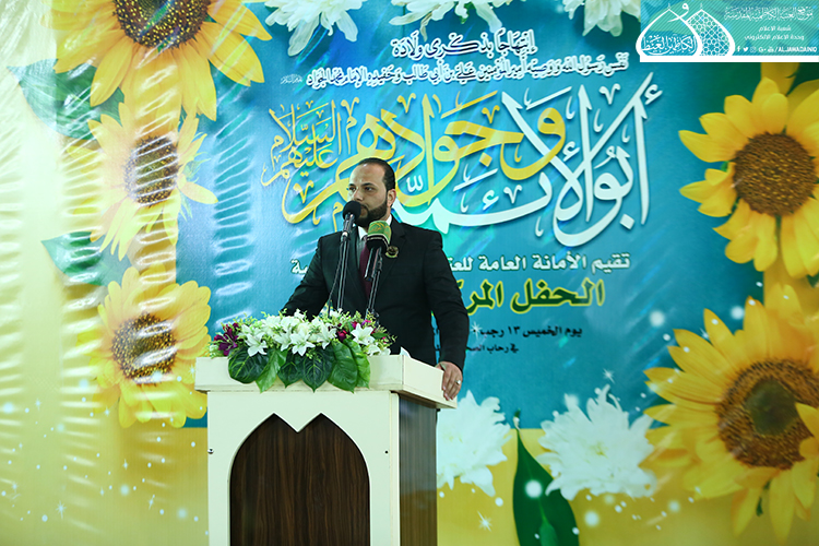 استٌهل الحفل بتلاوة آيات من الذكر الحكيم شنّف بها القارئ السيد عبد الكريم قاسم أسماع الحاضرين، تلتها كلمة الأمانة العامة للعتبة الكاظمية المقدسة ألقاها أمينها العام قائلاً: ( مع تقادمِ الأزمانِ، تعاودُنا في شهرٍ تعلوهُ غرةٌ غرّاءُ وهو شهرُ رجبٍ الأصبِّ، وقائعُ باسقاتٌ، حيث ولادةُ إمامِ المتقينَ وحفيدِهِ جوادِ العترةِ الهاديةِ "عليهما السلام". فمن المناسبِ جداً أن لا ينحصرَ الاحتفالُ بهاتينِ المناسبتينِ البهيَّتينِ في زاويةِ الثناءِ والإطراءِ الذي لا يؤدّي أي خدمةٍ لمنطقِ الوعي الإسلامي، أو أن ننظرَ إلى الولادتينِ الميمونتينِ على أنَّهما مجردُ استرجاعٍ لذكرى طيّبةٍ من دونِ أن نُدركَ مغزاهما الإنساني. فولاداتُ الأئمةِ الأطهارِ "عليهم السلام" هي نقاطٌ مضيئةٌ في حياتِنا يجبُ أن لا نمرَّ بها مروراً سطحياً، لذلك باتَ من اللبِّ أن نجعلَ من هذهِ المناسباتِ الروحيةِ محطّاتٍ للتزود بالزاد، وباعثاً ذاتياً يُحرّكُ فينا الصمودَ والجهادَ، ويقلبُ بوارَ نفوسِنا جناناً، وذلك يكون بعد أن نَعِيَ قيمتَها ونُحسنَ استثمارَها ونستلهمَ من هديِها. فالعِبرةُ التي يجبُ أن نخرجَ بها من هذا الإحياءِ والاحتفاءِ في حاضرِنا الراهنِ ونحنُ نعيشُ هذهِ الأوضاعَ المضطربةَ، حيث تشتدُّ حملةُ الإرهابِ المسعورةُ على الطليعةِ المؤمنةِ والبقيةِ الصامدةِ، هو أن نتابعَ خطواتِ أصحابِ هذه الذكرى في الدفاعِ عن بيضةِ الإسلامِ، وأن نجعلَ من جهادِهم رائدَنا في كفاحِنا ونضالِنا اليوم ضد أعدائهم.