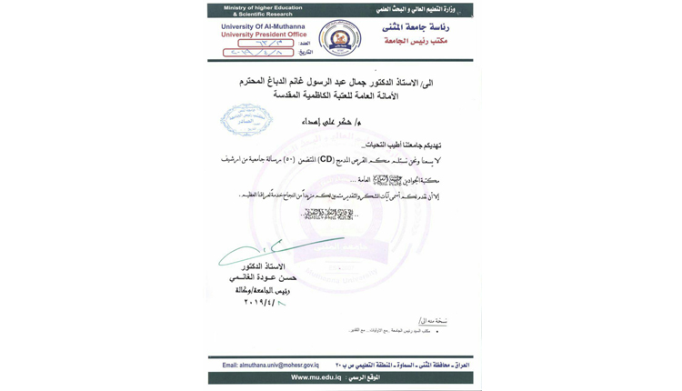 توجّه رئيس جامعة المثنى الأستاذ الدكتور حسن عودة الغانمي بالشكر والتقدير إلى الأمين العام للعتبة الكاظمية المقدسة الأستاذ الدكتور جمال عبد الرسول الدباغ، مثمناً مبادرته في إهداء مجموعة من الأقراص المدمجة، والتي تتضمن مجموعة من الرسائل والأطاريح الجامعية من أرشيف مكتبة الجوادين "عليهما السلام" العامة.