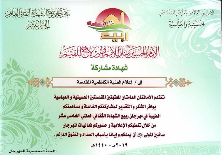 شعبة الإعلام في العتبة الكاظمية المقدسة .. تُكرَّم لمشاركتها المتميزة في فعاليات مهرجان ربيع الشهادة العالمي