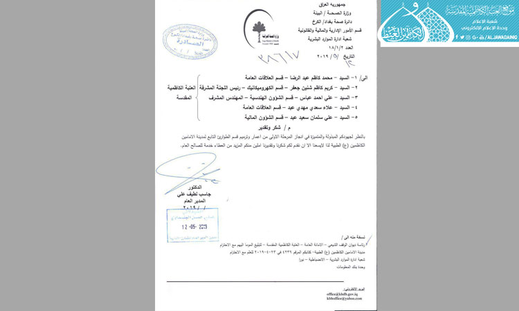 توّجه مدير عام دائرة صحة بغداد/ الكرخ الدكتور جاسب لطيف علي بالشكر والتقدير إلى اللجنة المُكلّفة من قبل الأمانة العامة للعتبة الكاظمية المقدسة في الاشراف على أعمال المرحلة الأولى من حملة تأهيل وإدامة الجوانب الخدمية والصحية في مدينة الإمامين الكاظمين "عليهما السلام" الطبية، وهم كلّ من رئيس اللجنة: المهندس كريم كاظم شنين، والمهندس المُشرف علي أحمد عباس، والخادم محمد كاظم عبد الرضا، والخادم علاء سعدي مهدي، والخادم علي سلمان سعيد، وذلك لجهودهم المباركة. وتجدر الإشارة أن الأمانة العامة للعتبة الكاظمية المقدسة تواصل سلسلة مشاريعها ومبادراتها الإنسانية، واستنفار جهود ملاكاتها الفنية من ذوي الخبرة والاختصاص والكفاءة العالية، وتؤكد حرصها الكبير على المساهمة بتقديم كلّ ما يمكن تقديمه من دعمٍ وإسنادٍ للمؤسسات التي تُعنى بتقديم الخدمات للمواطنين الكرام.
