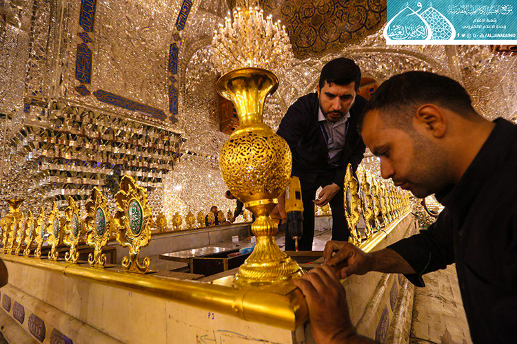 الصحن الكاظمي الشريف .. يشهد أعمال نصب وتركيب الأجزاء العلوية لشبّاك ضريح الإمامين الجوادين "عليهما السلام" بعد صيانتها وإعادة تذهيبها
