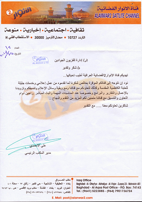 تلفزيون الجوادين يحصل على شهادة تقديرية من قبل قناة الأنوار الفضائية الثانية