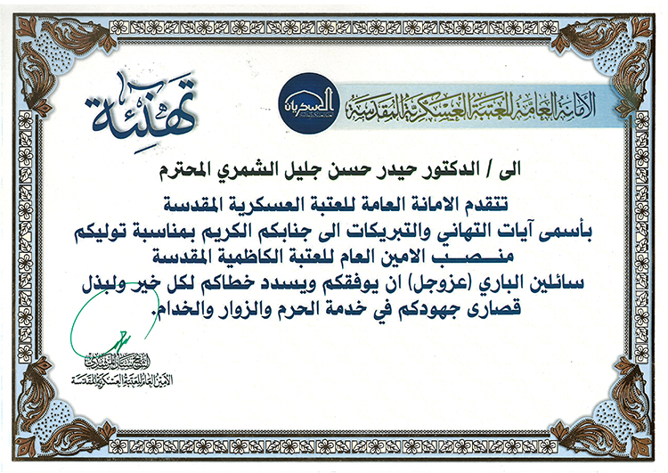 الأمين العام للعتبة العسكرية المقدسة يقدّم التهاني إلى الأستاذ الدكتور حيدر الشمّري لمناسبة تسنّمه مهام عمله أميناً عاماً للعتبة الكاظمية المقدسة
