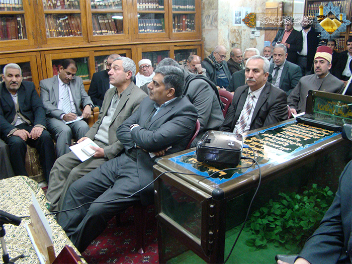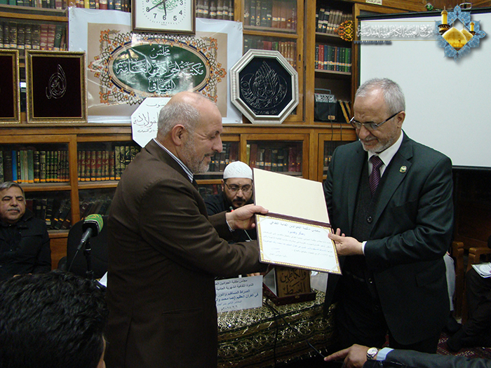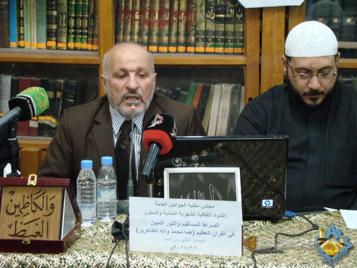 عقدت بمكتبة الجوادين(عليهما السلام) العامة في الصحن الكاظمي الشريف الندوة الثقافية الشهرية الحادية والستون مساء يوم الخميس 6/2/2014م بعنوان (الصراط المستقيم والنور المبين في القرآن العظيم) للباحث أ. د (بشير كاظم كنعان)، بحضور الأمين العام للعتبة الكاظمية المقدسة أ.د (جمال الدباغ) وأعضاء مجلس الإدارة والعديد من الشخصيات الدينية والعلمية والثقافية والأكاديمية، حيث استهلت الندوة بتلاوة مباركة من الذكر الحكيم تلاها القارئ (سامر الأنباري)، بعدها تحدث رئيس الجلسة سماحة الشيخ(عماد الكاظمي) وقدم فيها عنوان الندوة والتعريف بالسيرة الشخصية للباحث، ثم استعرض مقدمته الذي اعتمد فيها الباحث على تفسير القرآن بالقرآن لكشف المعاني العميقة وتجميع الآيات المشتركة، والأدعية والزيارات للكشف الواضح والعميق من كلام المعصومين، وتطبيقات العلوم الطبيعية النظرية الحديثة واستخدامها في معرفة فهم معاني القرآن الكريم والزيارات والأدعية وتطبيقاتها العملية في الحياة اليومية. بعدها ألقى أ. د (بشير كاظم كنعان) بحثه وتطرق فيه حول فضائل (سورة الفاتحة) المكية المدنية في القرآن الكريم وأسباب نزولها ووجوبها في الصلاة والكشف عن أسرار الكثير من مفرداتها، مبيناً محاورها الرئيسة (التوحيد، والصراط المستقيم، ويوم الدين)، ووضح من خلالها معرفة الهادي والهداية، واصفاً (الصراط المستقيم) بالموصل إلى مرضاة الله والجنة وذلك من خلال استدلاله بالآيات الكريمة بِسْمِ اللّهِ الرَّحْمنِ الرَّحِيمِ (يس، وَالْقُرْآنِ الْحَكِيمِ، إِنَّكَ لَمِنَ الْمُرْسَلِينَ، عَلَى صِرَاطٍ مُّسْتَقِيمٍ)، وقوله تعالى: (وَإِنَّكَ لَتَهْدِي إِلَى صِرَاطٍ مُّسْتَقِيمٍ)، كما أشار الى الولاية بأنها النظام والدرجات الثلاث من خلال قوله تعالى (إِنَّمَا وَلِيُّكُمُ اللّهُ وَرَسُولُهُ وَالَّذِينَ آمَنُواْ الَّذِينَ يُقِيمُونَ الصَّلاَةَ وَيُؤْتُونَ الزَّكَاةَ وَهُمْ رَاكِعُونَ) مؤكداً ذلك من الحديث النبوي الشريف والأدعية التي وردت عن الأئمة الأطهار(عليهم السلام)، هذا وقد شهدت فقرات الجلسة مداخلات من قبل السادة الحاضرين أثرت الندوة العلمية من حيث الطرح والحوار، واختتمت بتقديم شهادة تقديرية وهدية تذكارية الى أ.د (بشير كاظم كنعان) في الوقت نفسه تسلم أ.د (جمال الدباغ) هدية الأمانة العامة للعتبة الكاظمية المقدسة من قبل الباحث وهي عبارة عن لوحة فنية من صنعه مخطوطة بفن الأسلاك الفولاذية . من الجدير بالذكر أن انعقاد هذه الندوة قد تزامن مع الذكرى السنوية لوفاة سماحة السيد هبة الدين الشهرستاني(قدس سره) مؤسس مكتبة الجوادين(عليهما السلام) العامة.