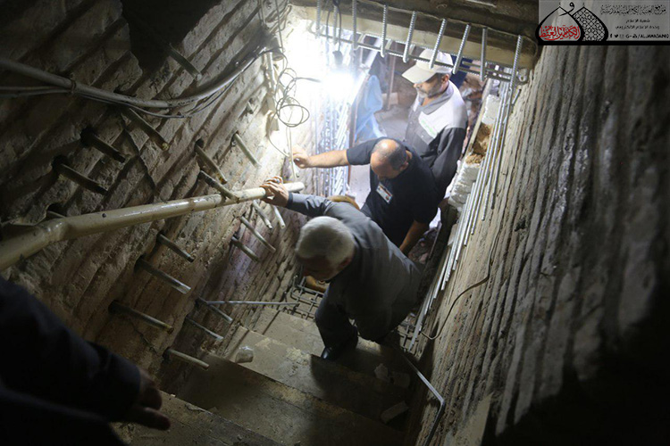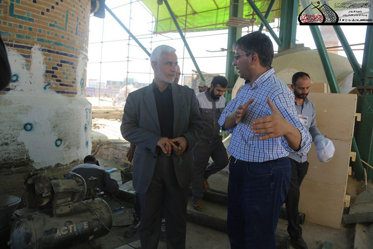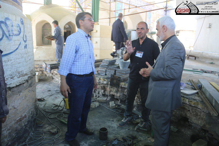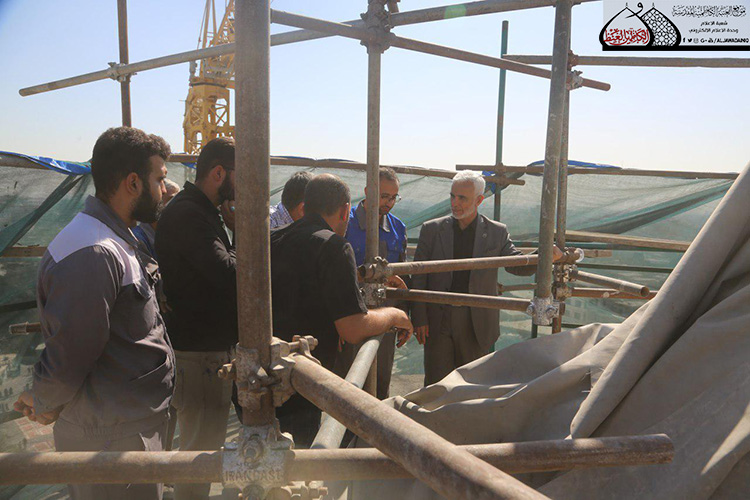 في سياق متصل تفقد السيد الأمين العام مشروع معالجة المنارة الشمالية الشرقية للصحن الكاظمي الشريف لمتابعة آخر التطورات التي يشهدها المشروع مستمعاً إلى شرح تفصيلي لما تم إنجازه في الجزء السفلي من أعمال صبّ ركائز الهيكل الكونكريتي، وصب أسس الجدران المحيطة بالمنارة، وإزالة الطبقات الإكسائية فضلاً عن أعمال المعالجة الإنشائية الأخرى، كما اطلع على أعمال الجزء العلوي للمنارة والذي يشهد عملية إزالة البلاطات الذهبية القديمة.