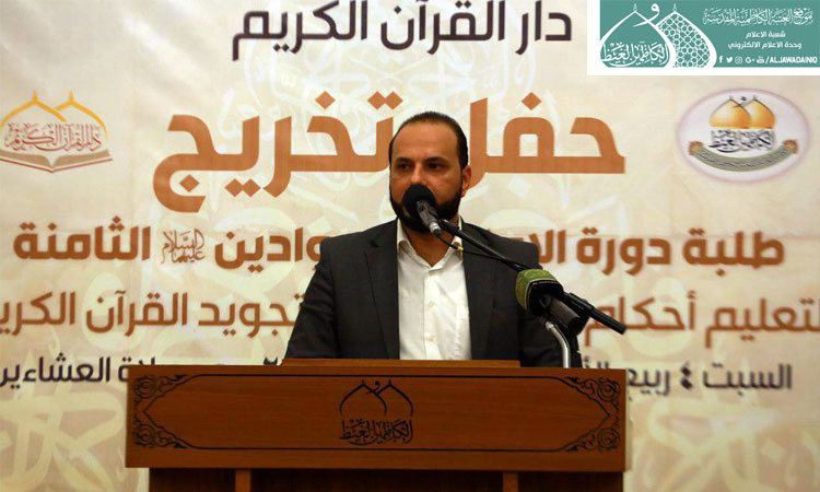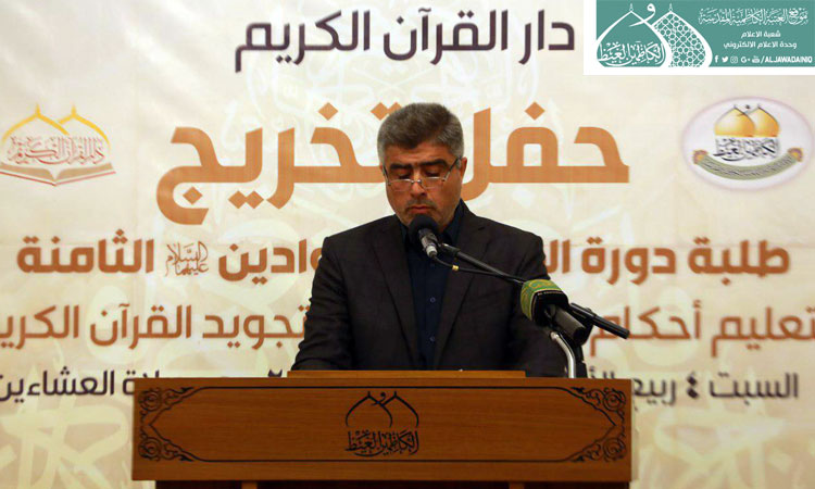 ولأنكم تعلمتم تلاوة القرآن وهو الثقل الأول، ودرستم أحكام تجويده في بيوت أذن الله أن ترفع ويذكر فيها اسمه في رحاب أهل البيت "عليهم السلام" ومن جوار الإمامين الكاظمين الجوادين "عليهما السلام" وهو الثقل الثاني فهنيئاً لكم ولعوائلكم ولأساتذتكم ولنا بكم عندما يشملكم حديث رسول الله "صلّى الله عليه وآله وسلّم" حين قال: (وَمَا اجْتَمَعَ قَوْمٌ فِى بَيْتٍ مِنْ بُيُوتِ اللَّهِ يَتْلُونَ كِتَابَ اللَّهِ وَيَتَدَارَسُونَهُ بَيْنَهُمْ إِلاَّ نَزَلَتْ عَلَيْهِمُ السَّكِينَةُ وَغَشِيَتْهُمُ الرَّحْمَةُ وَحَفَّتْهُمُ الْمَلاَئِكَةُ وَذَكَرَهُمُ اللَّهُ فِيمَنْ عِنْدَهُ)