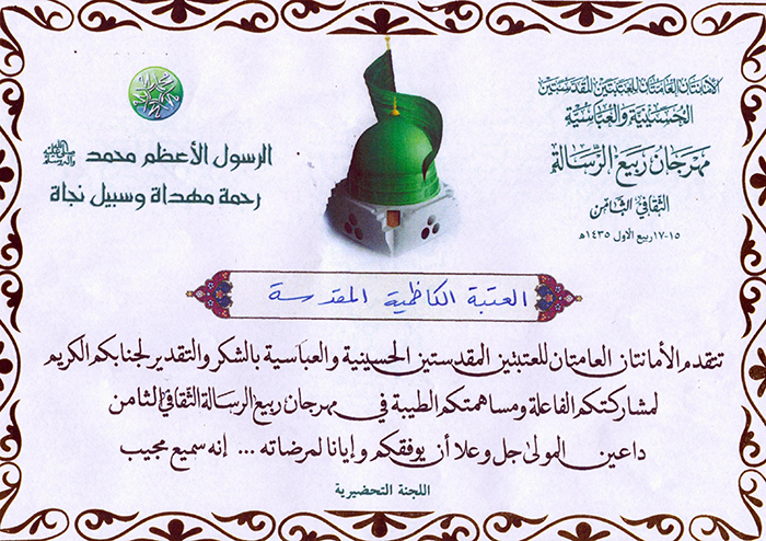 تقدمت الأمانتان العامتان الحسينية والعباسية المقدستين بالشكر والتقدير الى الأمانة العامة للعتبة الكاظمية المقدسة لمشاركة خَدَمَة الإمامين الجوادين(عليهما السلام) الفاعلة في مهرجان ربيع الرسالة الثقافي الثامن، وهذا دليل تعزيز العلاقات وتأكيد على مبدأ التواصل بين العتبات المقدسة والمزارات الشريفة لتحقيق أهدافها وبرامجها التنموية على الصعيد الرسالي والفكري والإنساني لخدمة أهل بيت النبوة(عليهم السلام) وزائريهم الكرام والتي أخذت اليوم تحتل المراكز الريادية ليس على مستوى العراق فقط بل على مستوى العالم أجمع.