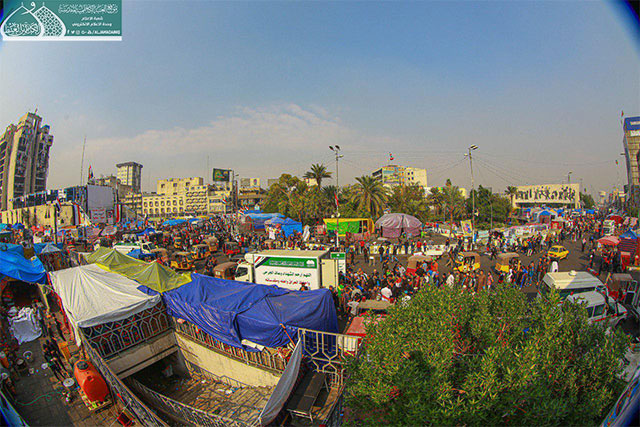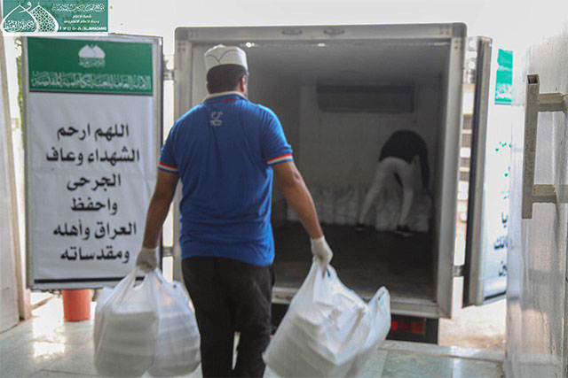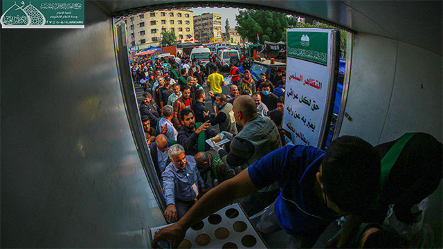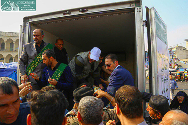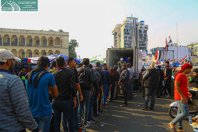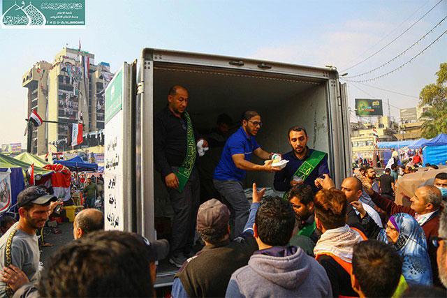 ما زالت العتبةُ الكاظمية المقدسة وبتوجيه من أمينها العام الأستاذ الدكتور حيدر حسن الشمّري تتواصل بإرسال قوافل الدعم اللوجستي وحملات الإمدادات الإنسانية إلى ساحة التحرير في العاصمة بغداد، حيث يجهز مضيف الإمامين الجوادين "عليهما السلام" التابع لقسم العلاقات العامة وجبات الطعام لتوزيعها على المتظاهرين السلميين، فضلاً عن توفير كميات كبيرة من مياه المراد الصحية، والاحتياجات الإنسانية الأخرى.