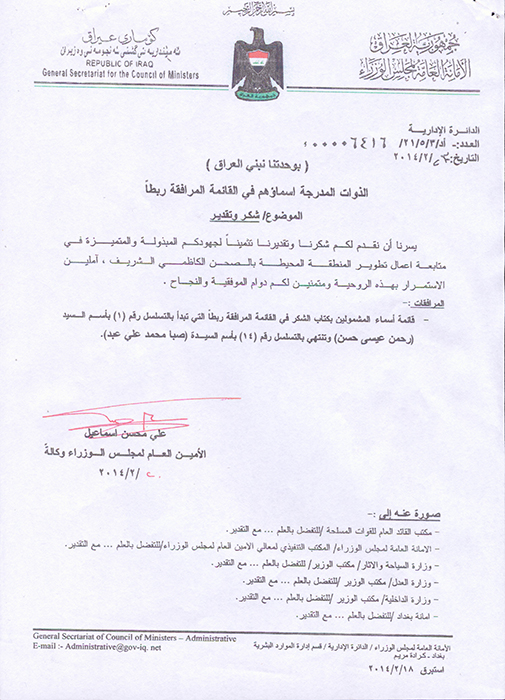 بعد وضوح الرؤية عن مشروع تطوير المنطقة المحيطة بالصحن الكاظمي الشريف والمتابعة الحثيثة والجادة من قبل الأمانة العامة للعتبة الكاظمية المقدسة لسير مراحل العمل فيه، فضلاً عن تواصلها مع المؤسسات المعنية في إنجاز هذا المشروع وتوظيف الطاقات والإمكانات وتذليل جميع المعوقات بكل ما يخدم الحركة العمرانية في مدينة الكاظمية المقدسة لتوفير مسارات جديدة لاستيعاب أعداد الزائرين الكبيرة وتقديم أفضل وسائل الراحة والخدمات لهم، تقدمت الأمانة العامة لمجلس الوزراء بالشكر والتقدير إلى الأمين العام للعتبة الكاظمية المقدسة أ.د(جمال الدباغ) ومستشار العتبة المقدسة السيد(موسى الاعرجي) لجهودهم المباركة وعطائهم المتميز واهتمامهم في متابعة أعمال التطوير متمنين لهم دوام الموفقية والنجاح .
