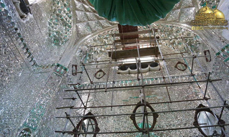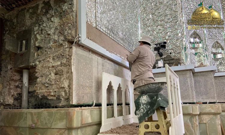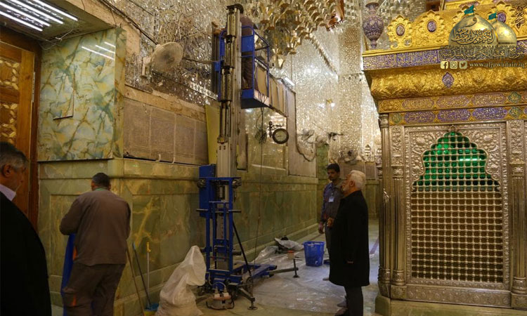 الخدماتُ المتنوعةُ في الحرم الشريف وبالتعاون مع الجهود الهندسية بتصميم خرائطَ بزخارفَ نباتيةٍ وهندسية للمرايا (العينه كاري) واستبدال القطع التالفة والمتضررة وتعويض المفقودة منها وتنفيذها بطريقة تتناسب وروعة هذا المشهدَ المقدس وتُـعطي للناظرين رونقاً وجمالاً، فضلا عن ترميمِ قسمٍ كبيرٍ من جدران الأروقة المباركة وانتهاءً بالحرم.
