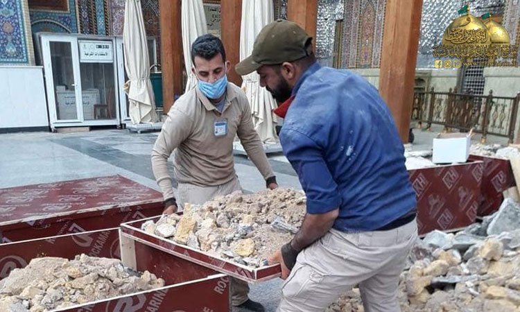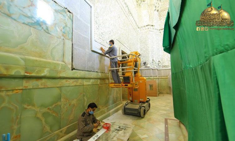 واستثماراً لقرار حظر التجوال الذي فرضته خلية الأزمة والجهات المختصة بسبب جائحة كورونا والذي أدى إلى عدم تواجد الزائرين أو قلة عددهم تم غلق الحرم والرواق لبدء العمل بحملة تأهيل وإعمار انطلاقا من أشرف بقعة في الصحن الشريف فتم صيانة المنطقة الموجودة أسفل الضريحين المقدسين باستبدال أرضية المرمر وإكساء ما بين الضريحين وداخلهما بالمرمر (الأونكس). وبأيدٍ ماهرة ومتخصصة تمت صيانة الأجزاء الخشبية لشباك الضريح واستبدال الأجزاء التالفة.. فلا يخفى على أحد أن المكان يحوي تفاصيل فنية دقيقة وقديمة في صندوقي الخاتم والمنطقة المحيطة بهما وتأثرها بعامل الرطوبة والأبخرة فكانت الحاجة إلى صيانتها بدقة عالية وبحذر وبطء حفاظا على الطابع الأثري للزخارف والآيات المنقوشة للصندوقين فضلا عن تغليفهما من الداخل بأفضل أنواع الخشب المستورد واستبدال الأعمدة الداخلية للشباك التي حفرت عليها أسماء المعصومين الأربعة عشر عليهم السلام وتبديل اللوحات الزخرفية والأقواس بنقوش مستوحاة من الفن الإسلامي ليظهر بحلة جديدة لإضافة مزيد من الرونق والبهاء لباطن شباك الضريح الذي تشرف بوضعه على القبرين الشريفين، حيث تقدر مساحة العمل بـ(2000م2).