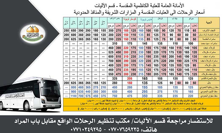 خدمة زائري أهل بيت النبوة "عليهم السلام" بكلّ أشكالها وصورها ما هي إلا الشرف الأعظم، واستناداً إلى توجيهات الأمين العام للعتبة الكاظمية المقدسة الأستاذ الدكتور حيدر حسن الشمّري، أطلق قسم الآليات في العتبة الكاظمية المقدسة برنامجاً خدمياً جديداً للزائرين الكرام وذلك من خلال تسيير رحلات يومية إلى العتبات المقدسة والمزارات الشريفة، والمنافذ الحدودية ذهاباً وإياباً، فضلاً عن تلبية دعوات الزائرين والمتعهدين الكرام حول برامج السياحة الدينية الخاصة، وتوفير السيارات الصغيرة للعوائل الراغبة بالزيارة بمفردها وبأسعار منخفضة.