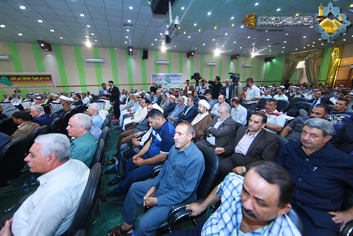 حضر وفد العتبة الكاظمية المقدسة الذي ترأسه نائب الأمين العام للعتبة الكاظمية المقدسة السيد"محمد الحيدري" وعدداً من أعضاء مجلس الإدارة ورؤساء الأقسام والشُعب وخَدَمة الإمامين الجوادين "عليهما السلام" مؤتمراً أقيم في قاعة صدر العراق، تحت شعار: "سلامة العراق واجب مقدس" ووجه فيه سماحة آية الله العظمى السيد "حسين السيد إسماعيل الصدر" وسط حضور حشد من الفضلاء ورجال الدين وشيوخ العشائر والوجهاء في مدينة الكاظمية المقدسة والمناطق المحيطة بها، ودعا فيها سماحته قائلاً : التقينا اليوم على حب قرة أعيننا العراق الجريح بيتنا وملاذنا وخيمتنا واجتمعنا من أجل القيم والمبادئ السامية التي تحفظ وجودنا وكرامتنا وعزتنا وانتمائنا، لنؤكد وأياكم أنتم رموز العراق الوطنية الحب والولاء للوطن العزيز ويجب أن نرتبط ارتباطاً حقيقياً مع العراق لأنه هو ماضينا وحاضرنا ومستقبلنا ..