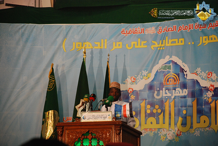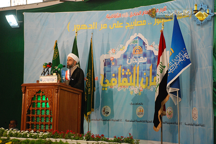 وشهد حفل افتتاح المهرجان كلمات عدة كان من بينها كلمة مؤسسة الإمام الصادق الراعية للمهرجان والتي ألقاها سماحة الشيخ "عقيل علي الزبيدي" بيّن في كلمته: "أنّ القضية المهدوية كانت وما تزال عرضةً للتشويه والتحجيم والتزييف بطرق شتى منذ زمنٍ سبق مولده الميمون، وما ذلك إلّا لأنّ أعداء الإسلام والمتلبّسين بثوبه يُدركون جيداً ما في التزام المجتمعات الدينية بهذه المنظومة العلمية والعملية من رفعة لهذه المجتمعات، لذا ولغيرها من الأسباب تحرّكت ماكنة التشويه والتسطيح على العديد من بقاع الإسلام، تدعمها قوى الاستعمار والاستكبار العالمي، ولم تكن هذه المدينة بمنأى عن محاولات طمس العقيدة المهدوية حتى هذه اللحظة، بل أراد لها المُتقمّصون أن تكون منطلقاً وقلعةً للفكر السلبي الهدّام، وأراد لها المؤمنون أن تكون مناراً وعلَماً يُرفع لصاحب هذا الأمر(عجّل الله فرجه) فكان بمشيئة الله مهرجان الأمان الثقافي السنوي".