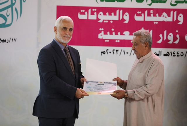 برعاية مباركة من قبل الأمين العام للعتبة الكاظمية المقدسة خادم الإمامين الكاظمين الجوادين الدكتور حيدر حسن الشمري، أقيم في رحاب الصحن الكاظمي الشريف حفل تكريم كوكبة من أصحاب المواكب والهيئات الحسينية والبيوتات والجوامع والحسينيات في مدينة الكاظمية المقدسة والمناطق القريبة منها، ضمن فعاليات مهرجان ربيع الولادة الخامس تحت شعار: (على صِراط أحمد)، احتفاءً بجهودهم المباركة ودورهم الفاعل وتعاونهم مع الأمانة العامة للعتبة الكاظمية المقدسة في تقديم الخدمة المتميزة للزائرين المتشّرفين بزيارة الإمامين الكاظمين الجوادين "عليهما السلام"، وإيواء جموع الوافدين من داخل العراق وخارجه خلال مليونية أربعينية الإمام الحسين "عليه السلام".