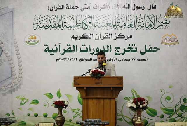 أعقبتها كلمة مركز القرآن الكريم وألقاها مدير وحدة التعليم القرآني والنشاط العلمي الأستاذ فراس الطائي بين خلالها قائلاً: (نلتقي اليوم على حُب كتاب الله الذي أُنزل على خير البشر، إذ تشرفنا في الأيام الماضية باحتضان ما يُقارب مئتي طالب من أولادنا وإخواننا، وكذلك بناتنا وأخواتنا ممن سعوا وجدّوا واجتهدوا في استكمال مناهجهم القرآنية المتخصصة في القراءة الصحيحة وأحكام التلاوة، وقواعد التجويد، والقراءة التحقيقية والإجازات العلمية، والتفسير وعلوم القرآن، فضلاً عن القراءة التطويرية، والنغم والمقامات بطريقتي الترتيل والتجويد (حضورياً وإلكترونياً) كما شارك في هذه الدورات كوكبة من طلبة الجامعات..