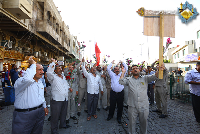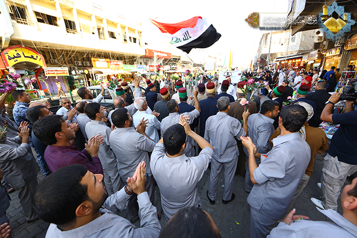 تجديداً للعهد والولاء لسيد البلغاء والمتكلمين أسد الله الغالب الإمام علي بن أبي طالب"عليه السلام" نظم موكب خَدَمَة العتبة الكاظمية المقدسة مسيرة ولائية انطلقت من حسينية آل الصدر متجهة نحو المشهد الكاظمي وصولاً إلى مرقد الإمامين الهمامين الكاظمين "عليهما السلام"، صدحت بها حناجر المشاركين بالهتافات التي عبرت عن الولاء المطلق للإمام علي بن أبي طالب "عليه السلام"، و تحفهم رايات العهد الولاء حاملين الشموع ابتهاجاً بعيد الولاية الكبرى والإمامة العظمى.