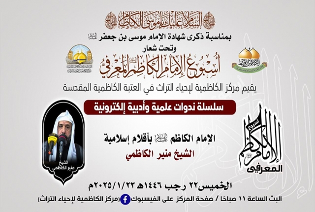 في رحاب الذكرى الأليمة، إذ تترددت عبارات الحزن في أروقة الزمن، لتحيي ذكرى استشهاد سجين بغداد موسى بن جعفر الكاظم "عليه السلام"، ذلك الإمام الذي أضاء دروب الإنسانية بمعارفه وسيرته الطاهرة، حين عاش مظلوماً محبوساً في ظلمات السجون، لكنه كان كالشمس التي تنير ولو خلف القضبان، ينثر الحكم، ويزرع بذور العلم والإيمان في أرجاء القلوب والعقول، وفي هذه الأيام التي تتشح بالسواد إجلالاً لذكراه، وبتوجيه من قبل خادم الإمامين الكاظمين الجوادين "عليهما السلام" الأمين العام للعتبة الكاظمية المقدسة الدكتور حيدر حسن الشمّري، انطلقت فعاليات أسبوع الإمام الكاظم "عليه السلام" المعرفي الأول، الذي أقامه مركز الكاظمية لإحياء التراث في العتبة الكاظمية المقدسة، بمشاركة نخبة الأساتذة والباحثين كل من: (الأستاذ الدكتور علي العبيدي، وفضيلة الشيخ عَدِي الكاظمي، وفضيلة الشيخ عماد الكاظمي، والمهندس عبد الكريم الدباغ، والشاعر محسن الموسوي، وفضيلة الشيخ منير الكاظمي، والباحث سمير موري)، والذي سيقدّم سلسلة من الندوات العلمية والأدبية عبر المنصات الإلكترونية، لتكون محطةً للتأمل في إمامنا الكاظم، وفرصة لإحياء معالم فكره النير، واستقاء الحكمة من فصول حياته الشريفة المليئة بالصبر والثبات على الحق حين اختزلت معاني التضحية والوفاء لله تعالى ولنبينا الأكرم "صلى الله عليه وآله وسلم" ورسالته السماوية.