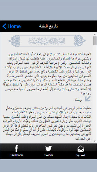 اطلقت الأمانة العامة للعتبة الكاظمية المقدسة/ تقنية المعلومات التطبيق الرسمي الخاص بالهواتف الذكية، بنظامي التشغيل " iOS" ، "Android " لتوفير فرصة التواصل مع زائري ومتصفحي موقع العتبة الكاظمية المقدسة والذي يتميز باستخدام تقنية "RSS " ويمكنهم التعرف على أخبار العتبة المقدسة ونشاطاتها وفعالياتها وإعلاناتها ومشاريعها فضلاً عن المكتبة العامة والمكتبة الصوتية، والصورية، والمرئية، وتقديمه خدمة الزيارة بالإنابة، ضمن شبكات التواصل الاجتماعي .