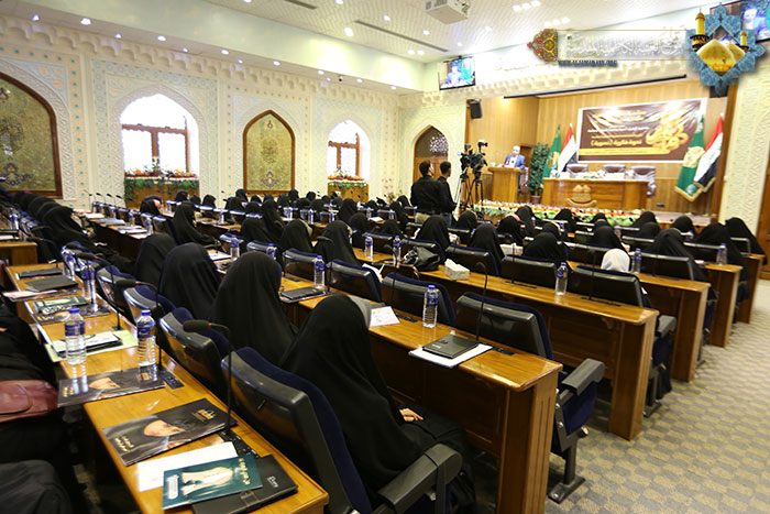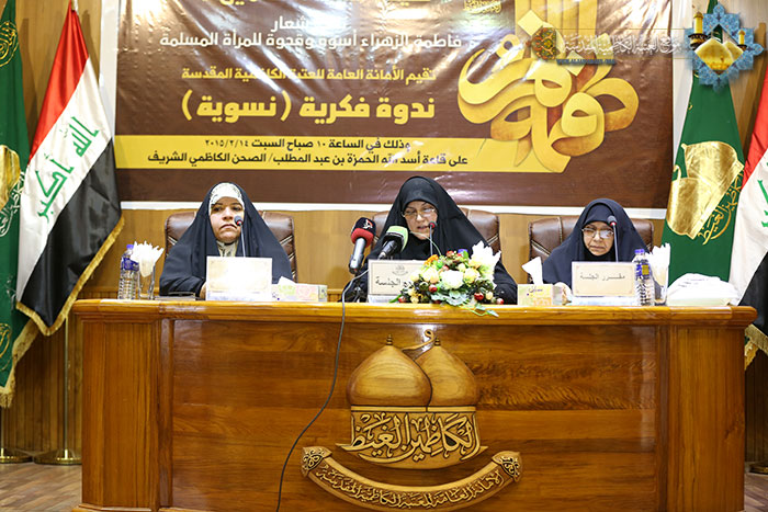 من ذرى الأمجاد، ورحاب الطهر والقداسة، من مثوى الإمامين الهمامين الكاظمين"عليهما السلام", أقامت الأمانة العامة للعتبة الكاظمية المقدسة/ وحدة النشاط النسوي التابعة لقسم الرقابة النسوية وبالتعاون مع خادمات قسم الشؤون الفكرية والثقافية ندوة ثقافية فكرية، يوم السبت 2015/2/14م على قاعة الحمزة بن عبد المطلب "عليه السلام", تحت شعار : ( فاطمة الزهراء "عليها السلام" أسوة وقدوة للمرأة المسلمة ), بحضور ثلة طيبة من النساء من مختلف الشرائح الاجتماعية، قدمت خلالها الباحثة أ.د عهود عبد الواحد العكيلي بحثاً قيّماً تناولت فيه السيرة المباركة للسيدة الزهراء "عليها السلام"،الأسوة الحسنة التي يجب ان تقتدي بها نساء العالمين قاطبة, والسير على نهجها القويم، لأنها الإنموذج والمدرسة المتكاملة في المعارف والعلوم والأدب والدين والسلوك السليم, والخلق الكريم, فضلاً عن تسلحها بالعلم والمعرفة والدراية في علوم الشريعة المقدسة.