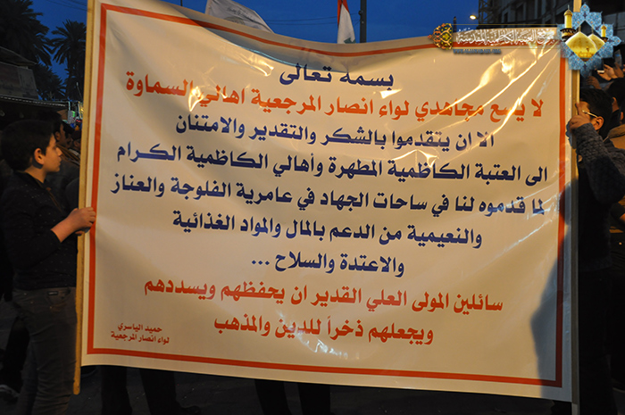 مضيفاً: نعاهدكم من هذا المكان الطاهر سنبقى جند المرجعية الأوفياء وماضون للدفاع عن أرض العراق ومقدساته، ونسأل الله أن يسدد خطى الجميع ويأخذ بأيديهم حتى تحقيق النصر .