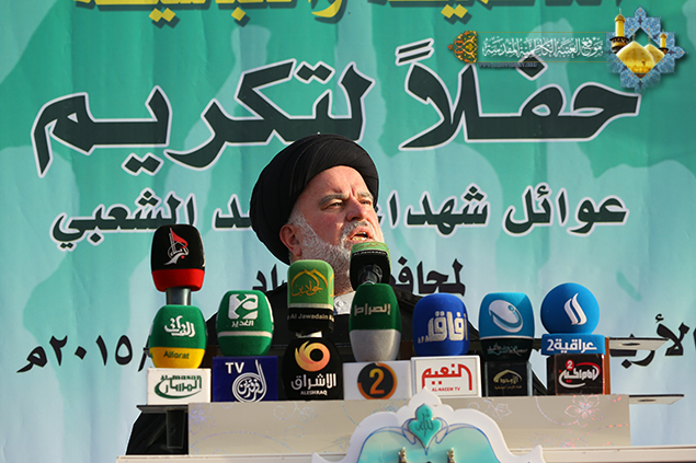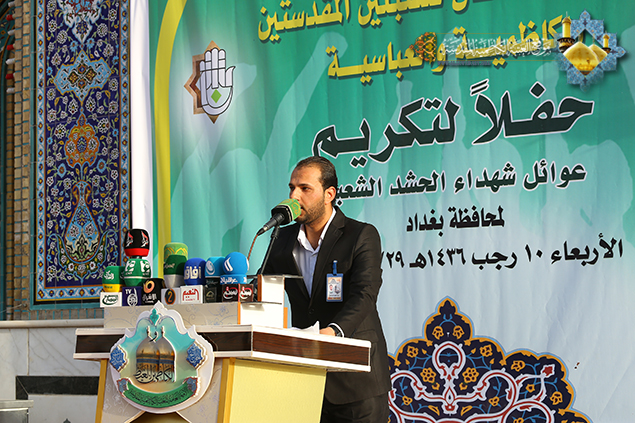 إكراماً للدماء الطاهرة التي نزفت من أجل العراق، وتقديراً لشهداء العقيدة والوطن السائرين في دروب التضحية والولاء والفداء، الذين عقدوا العزم لبذل أرواحهم ومهجهم لإعلاء كلمة الحق ونيل عظيم شرف الدنيا وسعادة الآخرة ، ملبين للنداء المقدس الذي أطلقته المرجعية العليا المتمثلة بسماحة آية الله العظمى السيد علي الحسيني السيستاني "دام ظله الوارف" في الجهاد الكفائي والدفاع عن العراق ومقدساته من دنس أعداء الله والإنسانية الإرهاب التكفيري. ومن منطلق الشعور بالمسؤولية تجاه هؤلاء المؤمنين وعوائلهم، أقامت الأمانتان العامتان للعتبتين المقدستين الكاظمية والعباسية عصر الاربعاء 10رجب الأصب 1436هـ الموافق 29/4/2015م في رحاب الصحن الكاظمي الشريف، حفل تكريم عوائل شهداء الحشد الشعبي في بغداد بحضور وكيل المرجعية العليا في مدينة الكاظمية المقدسة سماحة الشيخ حسين آل ياسين ورئيس ديوان الوقف الشيعي سماحة السيد علاء الموسوي ونائب الأمين العام للعتبة الكاظمية المقدسة السيد محمد الحيدري وأعضاء مجلس الإدارة وممثلي العتبة العباسية المقدسة ونخبة من السادة والمشايخ الفضلاء معتمدي المرجعية الرشيدة وعدد من الشخصيات الاجتماعية ومجاهدي الحشد الشعبي. استهل الحفل بتلاوة من الذكر الحكيم عطر بها مسامع الحاضرين الحاج "همام عدنان" بعدها ألقى سماحة الشيخ حسين آل ياسين كلمة المرجعية العليا المتمثلة بسماحة آية الله العظمى السيد علي الحسيني السيستاني قائلاً: " نقف بين أيدي الأمهات الرواحم والزوجات السواكن والآباء المعظمين والأطفال الأيتام بين آمالهم وآلامهم، نقف عبيداً لإحسان شهدائهم، فإن كان المعلم حرفاً يستحق الاتباع والعبودية بمعنى الطاعة، فكيف بهؤلاء الأبطال الذين قد علمونا دروساً في الذود عن الدين والقيم والوطن والمقدسات، ودروساً في نسيان كلّ الآلام والحرمان الذي يعانون منه، عندما هبوا مسرعين مبادرين متقربين إلى الله سبحانه وتعالى، مقتدين بالصالحين من محمد وآله الطاهرين، على بصيرة من أمرهم عندما لبّوا نداء نائب الإمام المنتظر "عجل الله فرجه الشريف" فتوى سماحة آية الله العظمى السيد السيستاني "دام ظله الوارف" ، والتي أيدها جميع مراجعنا في النجف الأشرف، لبّوها وهم يرون أنفسهم مقصربن في حق الدين والأوطان وكلهم نداء لواعية الإمام الحسين "عليه السلام"، ونحن تحت ظلال الإمامين الهمامين الجوادين "عليهما السلام" نهنئ هؤلاء الأبطال المتميزين في إقامتهم لشعائر الله في ساحات القتال ذوداً عن مبادئهم وطاعة لمرجعيتهم..