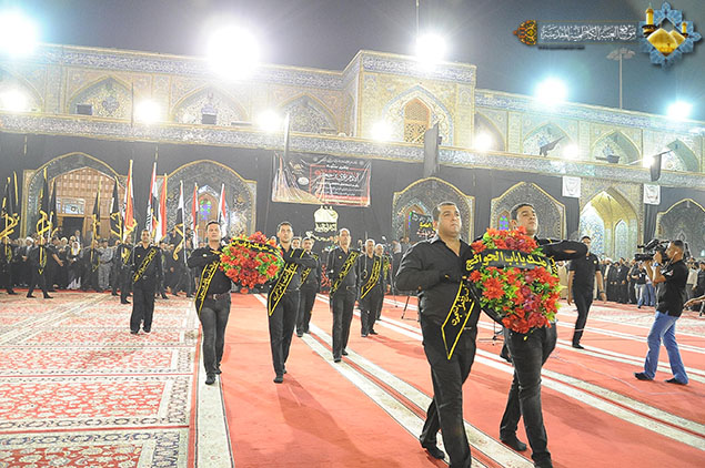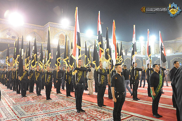لوحة جديدة رسمتها رحاب الإمامين موسى والجواد "عليهما السلام" وهي تؤمّ القلوب الموالية المؤمنة لتجسد في طياتها مشاهد الحزن والآلم والأسى لفقد الإمام المسموم المظلوم والمعذب في قعر السجون الإمام موسى بن جعفر الكاظم "عليه السلام"، لتعود بهم الذكرى إلى شذرات حياته الشريفة ومناقبه وصبره وكبريائه وتقواه، إذ شهدت رحاب الصحن الكاظمي الشريف ليلة الأحد 22 رجب الأصب 1436هـ، والموافق 10 أيار 2015مراسم استبدال رايتي قبتي الإمامين الجوادين "عليهما السلام" برايات الحزن السوداء في مراسم مهيبة جرت وسط حضور وكيل المرجع الديني الأعلى سماحة آية الله العظمى السيد علي الحسيني السيستاني "دام ظله الوارف" في مدينة الكاظمية المقدسة سماحة الشيخ حسين آل ياسين ومعالي رئيس ديوان الوقف الشيعي سماحة السيد علاء الموسوي والأمين العام للعتبة الكاظمية المقدسة أ. د جمال عبد الرسول الدباغ، والسادة أعضاء مجلس الإدارة ورؤساء الأقسام والشعب ، وممثلي العتبات المقدسة، وعدد من الشخصيات الدينية والسياسية والاجتماعية وجمع غفير من وجهاء وشيوخ مدينة الكاظمية المقدسة ومسؤولي دوائرها الأمنية والخدمية وزائري الإمامين الجوادين "عليهما السلام". استهلت المراسم بتلاوة مباركة من الذكر الحكيم شنف بها قارئ العتبة السيد عبد الكريم قاسم أسماع الحاضرين، تلتها مشاركة لموكب السادة والمشايخ الفضلاء في الحوزة العلمية الشريفة ومواكب مدينة الكاظمية المقدسة وهي تعلن حدادها لذلك المصاب الجلل الذي فجر المآقي وأفجع القلوب، بعدها كلمة الأمانة العامة للعتبة الكاظمية المقدسة ألقاها أمينها العام أ . د جمال الدباغ وبيّن فيها قائلاً: " إننا إذ نحيي ذكرى إستشهاد مولانا كاظم الغيظ "عليه السلام" يستوجب منا ذلك أن نستلهم منه كل معاني الخير والصلاح, ونتأمل فيه لغة المحبة والتسامح وحب الخير للجميع , فمن الواجب أن تشيع بيننا جميعاً لغة المحبة والتسامح ونجعل من سيرة العبد الصالح مفتاحاً للتوغل إلى قلوب الآخرين , كما يجب أن نتعلم منه معنى الصمود والإرادة والتصدي للظلم والعدوان, خصوصاً ونحن نعيش مرحلة الصراع والتحدي مع الأعداء فينبغي أن نجعل من هذه الزيارة المليونية والمسيرة الجماهيرية الزاحفة إلى مرقدي الإمامين الجوادين "عليه السلام" عنواناً للتحدي والإصرار على مواجهة أعداء الله والوطن والمقدسات . وأضاف قائلاً: لقد تظافرت جهود كثيرة من أجل خدمة الزائرين القاديمين حيث اشترك ديوان الوقف الشيعي والعتبات المقدسة والمؤسسات الحكومية ومنظمات المجتمع المدني والمواكب الحسينية والأهالي، وهناك من هذه السنة مشروع التبليغ الديني الذي تقوم به العتبات المقدسة مجتمعة بإشراف المرجعية الدينية العليا المتمثلة بسماحة آية الله العظمى السيد علي الحسيني السيستاني "دام ظله الوارف" وسيغطي المشروع مدينة الكاظمية المقدسة وأنحاء بغداد.