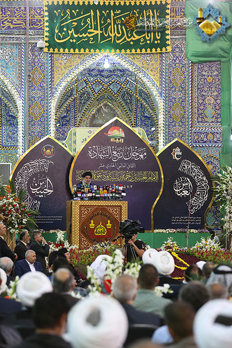 مضيفاً: إنّنا نجتمع اليوم لنقف على معاني الدين الصحيحة الحقيقية غير المنحرفة التي لا تحمل إلّا معاني الحبّ والسلام وتحترم الآخر ومن يملك قناعةً أخرى وتصون الدم والمال والعرض، مؤكداً على العودة إلى سبل الحقّ التي نادى بها الإمام الحسين"عليه السلام" والرجوع إلى تراثنا الخالد والأصيل.