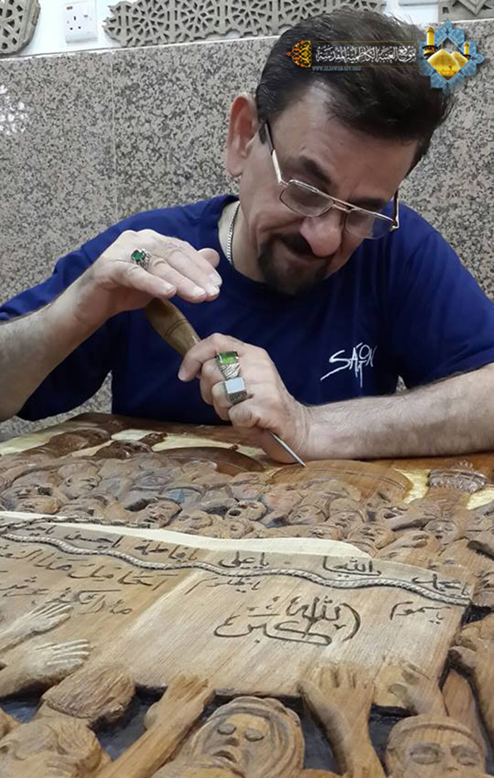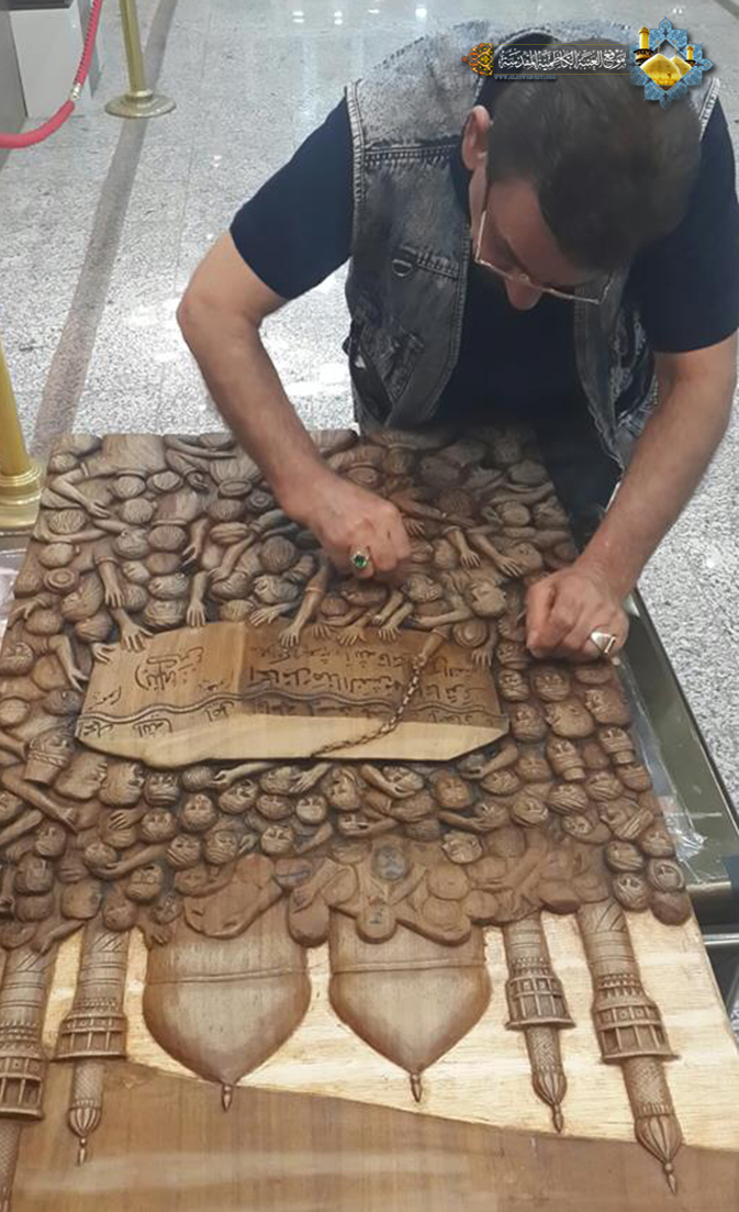 مضيفاً: أن ما يميز هذه اللوحة عوامل عدة منها مدة العمل التي استغرقت سبعة أشهر تقريباً على تنفيذها، وطبيعة الخشب المستخدم فيها هو الصاج، المأخوذ من خشب باب المراد القديمة، فضلاً عن توظيف الخيال لتخليد عدد الشخصيات من خَدَمة الإمامين الجوادين "عليهما السلام"، والتي استطعت أن أجسد فيها أكثر من 70% لملامح كلّ شخصية، وكان هناك تشجيع كبير ومتابعة حثيثة من قبل السيد الأمين العام للعتبة الكاظمية المقدسة أ. د جمال عبد الرسول الدباغ، وكانت نظرته لهذا العمل بمثابة حافز ودعم بأن تكون هناك لوحة تجسد مرحلة تاريخية لمسيرة إمام المعصوم، قد تصور من خلالها تلك الحشود التي تتدفق كالسيل الهادر، فالحمد الله قد عبَرت هذه اللوحة الفنية عن أبعاد حقيقة دافع من أجلها إمامنا موسى بن جعفر الكاظم "عليه السلام" والانتصار التي تحققت في مسيرة الحق على الباطل، وانتصار السجين على السجان، وثورة ضد الظلم والاضطهاد، بل عَبَرت عن كلّ المعاني الأخلاقية والإنسانية السامية التي تخلد عظماء ورموز هذه الأمة، في الوقت الذي تحاول فيه قوى التكفير والإرهاب تهديم هذه الآثار العظيمة وطمس معالم ديننا الإسلامي الحنيف ونقول لهم " أنتم تهدمون الحضارات .. ونحن نبني حضارتنا لأن لنا تاريخ وجذور تضرب في أعماق الأرض ونعتز بها "، من خلال منبركم الكريم أدعو الله العلي القدير أن نوفق لإعمار مراقد أئمتنا والعتبات المقدسة وصروح الإسلام والمسلمين والتي نعدها قبلة العاشقين المؤمنين وأن نجسدها بأعمالنا الفنية لتبقى خالدة لأجيالنا القادمة، وسيكون هناك من الأعمال الجديدة الذي يرى النور قريباً بعونه تعالى لوحة الإمام الكاظم "عليه السلام" في سجن السندي بن شاهك وزنزانة الطغاة.