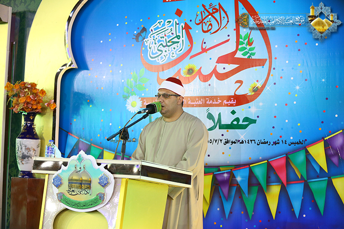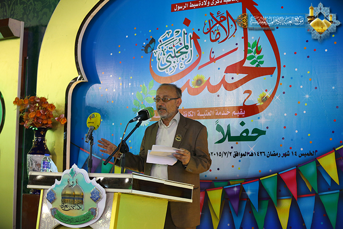 بمناسبة ذكرى ولادة ثاني الأئمة الأمناء، كريم أهل البيت وسيد شباب أهل الجنة الإمام الحسن المجتبى "عليه السلام" الذي انبثق من وحي النبوة ونور الإمامة، ليرفع الله تبارك وتعالى به كيان الإسلام، ويشيد به صروح الإيمان، أقامت الأمانة العامة للعتبة الكاظمية المقدسة حفلاً بهيجاً ليلة الخامس عشر من شهر رمضان المبارك 1436هـ في رحاب الصحن الكاظمي الشريف، بحضور الأمين العام للعتبة الكاظمية المقدسة أ.د جمال عبد الرسول الدباغ وأعضاء مجلس الإدارة وعدد من من الشخصيات الدينية والاجتماعية والسياسية وجمع غفير من زائري الإمامين الجوادين " عليهما السلام"، استهل الحفل بتلاوة مباركة من الذكر الحكيم شنف بها قارئ جمهورية مصر العربية الشيخ أحمد عبد الحي أسماع الحاضرين، تلتها كلمة الأمانة العامة للعتبة الكاظمية المقدسة ألقاها أمينها العام أ. د جمال الدباغ بين فيها قائلاً: " إن الحديث عن مولد مولانا السبط الحسن "عليه السلام" وإن كان يشملُنا بالمسرَّة والابتهاج فهو يشوبُنا بالحزن والألم حسرةً على ما تعرضَ له سبطُ الرسول وقُرّةُ عينه من الجَورِ والقهرِ من قبَل أعدائه المنافقين من حوله والمتخاذلين المتقاعسين عن نصرته.