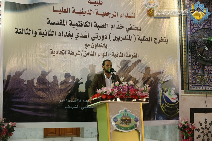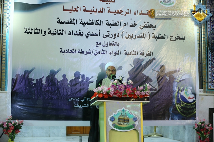 وكانت هناك كلمة لممثل قائد الفرقة الثانية العميد الركن مالك المالكي، بيّن خلالها إن هذه الدورات التدريبية التي تلقاها الشباب في دورة أسَدي بغداد الثانية والثالثة هي رافد مهم لتعزيز القدرات القتالية للمشاركة في الدفاع عن العراق. كما أشار فيها إلى دور مجاهدي الحشد الشعبي الأبطال الذين سطّروا أروع الملاحم ورخصوا دماءهم الزكية، ووقفوا صفاً واحداً في مساندة القوات الأمنية بمعارك تحرير العراق لاستعادة أمن البلاد. وشهد حفل التخرج مشاركة للرادود الحسيني كرار الكاظمي بالقصائد والأهازيج الولائية التي تفتخر بانتصارات حشدنا المبارك، ومن ثم توزيع الشهادات التقديرية والهدايا على المتدربين، واختتمت بقراءة سورة الفاتحة المباركة ترحماً على أرواح شهداء العراق وشهداء العقيدة في الحشد الشعبي المقدس.