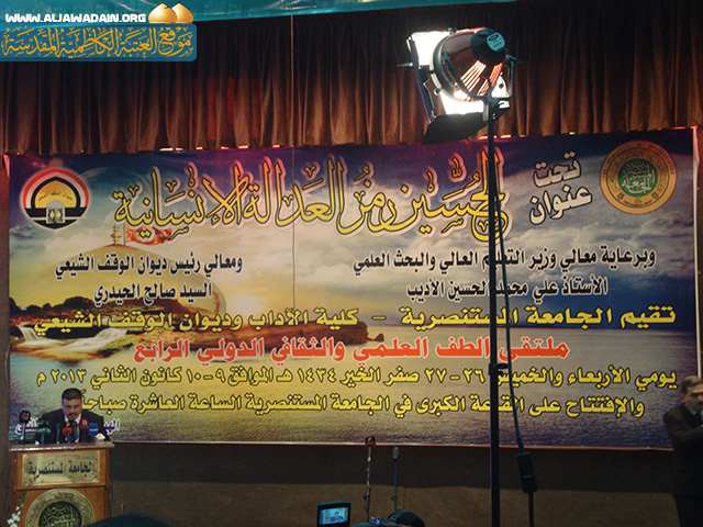 وتحت عنوان الحسين(ع) رمز العدالة الاجتماعية, انطلقت فعاليات ملتقى الطف العلمي الثقافي الدولي الرابع, والذي اقيم على القاعة الكبرى في الجامعة المستنصرية للفترة من 26ـ 27 صفر 1434هـ, برعاية معالي وزير التعليم العالي والبحث العلمي الدكتور(علي الأديب) والسيد رئيس ديوان الوقف الشيعي سماحة السيد(صالح الحيدري)