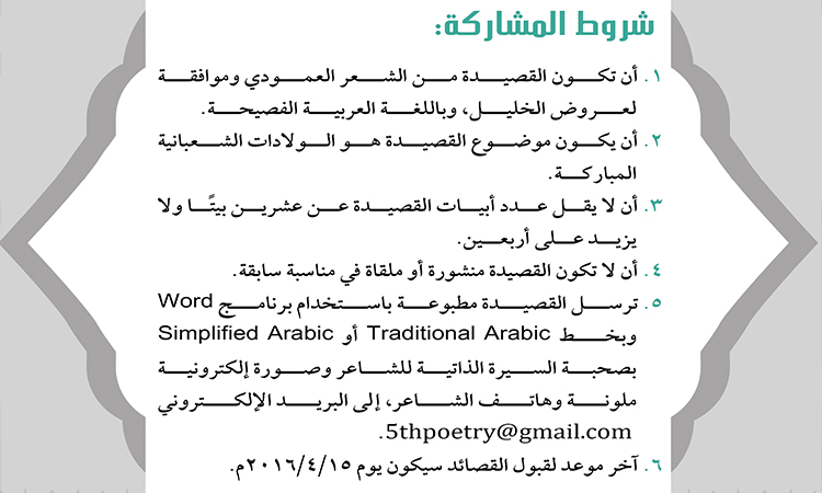 تواصل الأمانة العامة للعتبة الكاظمية المقدسة مشروعها الثقافي ومشوارها في دعم الحركة الأدبية والفكرية، إيماناً منها بضرورة الاهتمام بالإبداع والمبدعين والأدباء والشعراء والمثقفين، حيث أعلنت اللجنة التحضيرية للمؤتمر العلمي الدولي السابع إقامة المهرجان السنوي الخامس للشعر العربي تحت شعار: (تُستلهم القوافي ويسمو الشعر بولادات الشموس الشعبانية) للمدة من 6ـ 7 شعبان 1437هـ الموافق 13 ـ 14 آيار 2016م، وبينّت اللجنة التحضيرية أن القصائد تُسَلّم في موعد أقصاه 15 نيسان 2016 إلى البريد الإلكتروني: 5thpoetry@gmail .com