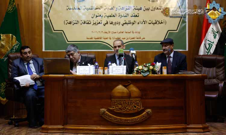 حرصت العتبة الكاظمية المقدسة على احتضان ورعاية العديد من الندوات والمؤتمرات العلمية لكثير من المؤسسات الحكومية من أجل إثراء الساحة الثقافية والعلمية التي تسعى من خلالها إلى الإسهام في عملية التغيير والتطوير النوعي لبنية المجتمع العراقي والإسلامي، فضلاً عن تحقيق أهداف النزاهة ومكافحة الفساد في مفاصل المؤسسات الحكومية، وعدم السماح لتلك السلوكيات المنحرفة بأن تسري بين الأوساط الاجتماعية، لذا استضافت الأمانة العامة للعتبة الكاظمية المقدسة في قاعة سيد الشهداء الحمزة بن عبد المطلب "عليه السلام" في رحاب الصحن الكاظمي الشريف صباح الأربعاء ٢٢ربيع الآخر١٤٣٧هـ الموافق 3 شباط 2016م الندوة العلمية التي أقامتها هيئة النزاهة بالتعاون مع العتبة الكاظمية المقدسة بعنوان : " أخلاقيات الأداء الوظيفي ودورها في تعزيز ثقافة النزاهة" بحضور الأمين العام للعتبة الكاظمية المقدسة أ . د. جمال عبد الرسول الدباغ وأعضاء مجلس الإدارة والدكتور حسن الياسري رئيس هيئة النزاهة وعدد من مديري الدوائر الحكومية ونخبة من موظفي هيئة النزاهة وخَدَمَة الإمامين الجوادين، استهلت الندوة بتلاوة آيٍ من كتاب الله العزيز شنف بها أسماع الحاضرين القارئ السيد عبد الكريم قاسم، بعدها القى الأمين العام للعتبة الكاظمية المقدسة كلمة بهذه المناسبة قائلاً: " هناك مسؤولية ملقاة على عاتق العتبة الكاظمية المقدسة تحتم عليها أن تساهم في تطور المجتمع، ولها أدوار متنوعة ومتعددة مع الدوائر الحكومية والجامعات والمؤسسات الإنسانية"