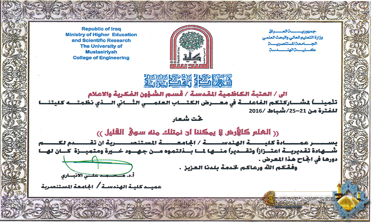 توجهت عمادة كلية الهندسة/ الجامعة المستنصرية ببالغ شكرها وتقديرها إلى العتبة الكاظمية المقدسة ـ قسم الشؤون الفكرية والإعلام وذلك لمشاركتها الفاعلة في معرض الكتاب العلمي الثاني الذي أقيم للمدة من 21 ـ 25 شباط 2016 تحت شعار (العلم كالأرض لا يمكننا أن نمتلك منه سوى القليل)، وتؤكد الأمانة العامة للعتبة الكاظمية المقدسة بهذه المشاركات على منهجها العام وستراتيجيتها في التنمية الإنسانية، وإيمانها برعاية شريحة الشباب والاهتمام بهم لتعزيز الوعي المعرفي وترسيخ المفاهيم الأخلاقية والإسلامية والتوجيهات التربوية والعقائدية لديهم.